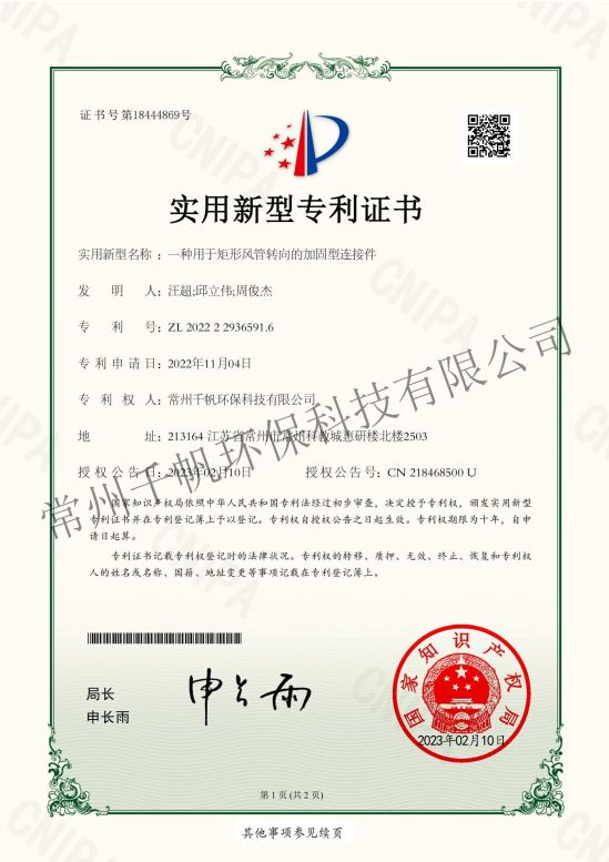 實(shí)用新型專(zhuān)利證書(shū) 一種用于矩形風(fēng)管轉(zhuǎn)向的加固型連接件